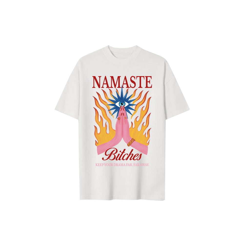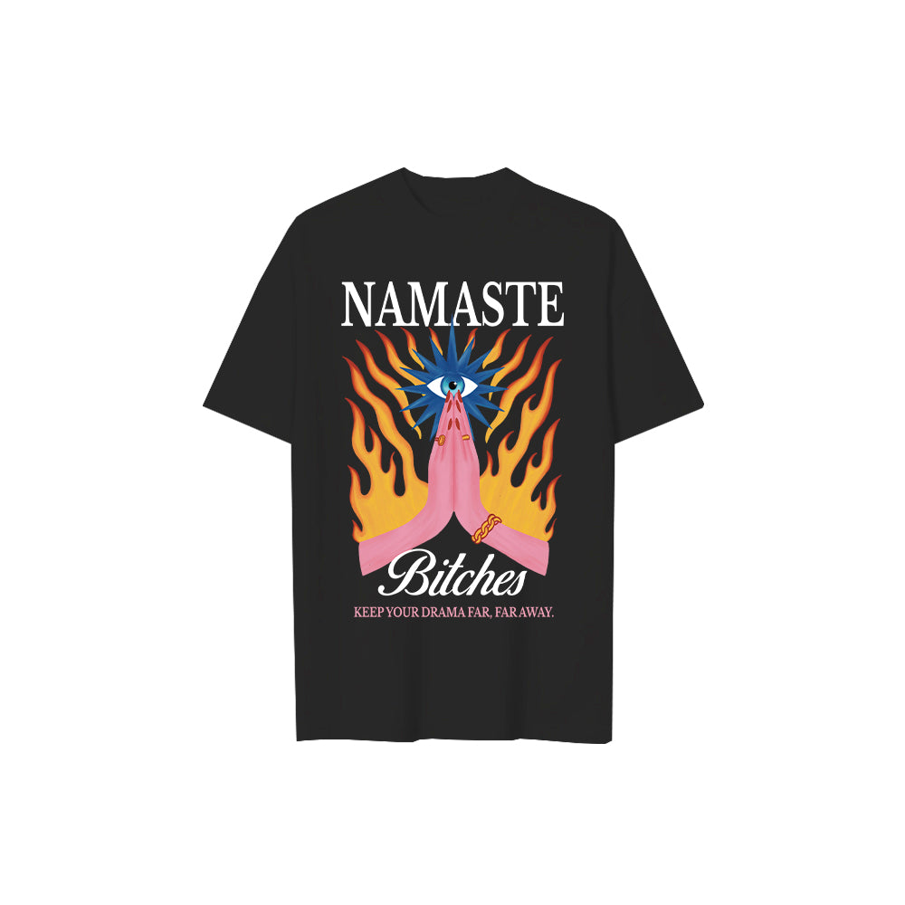 Con un diseño que mezcla fuego —símbolo de transformación— y manos en posición de oración, esta prenda se ríe de los mandatos y te invita a mantener el drama bien lejos.